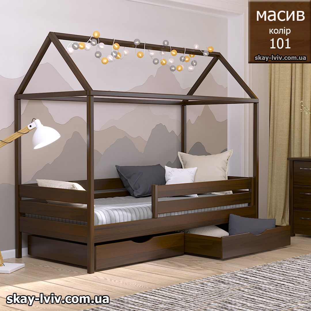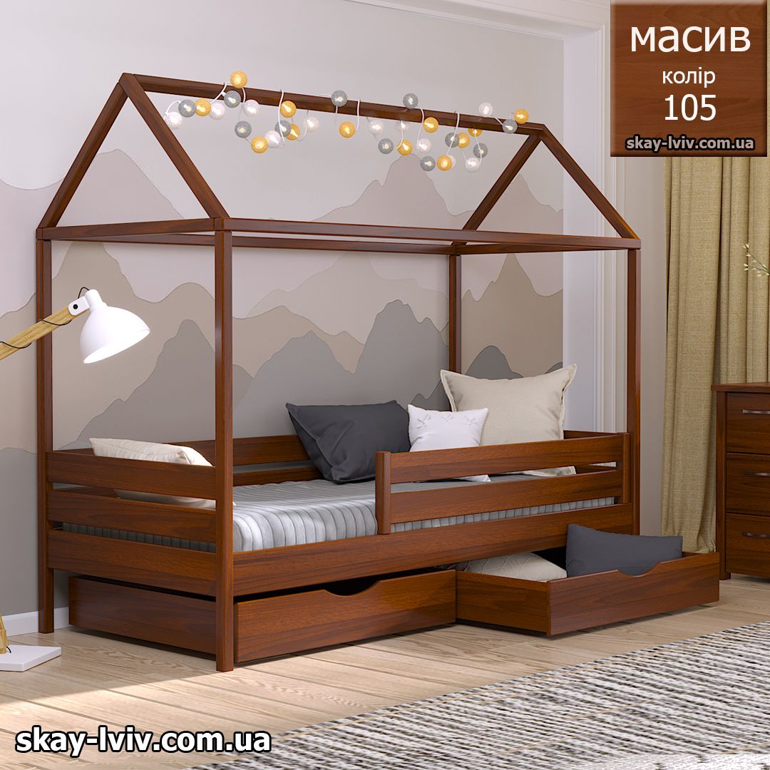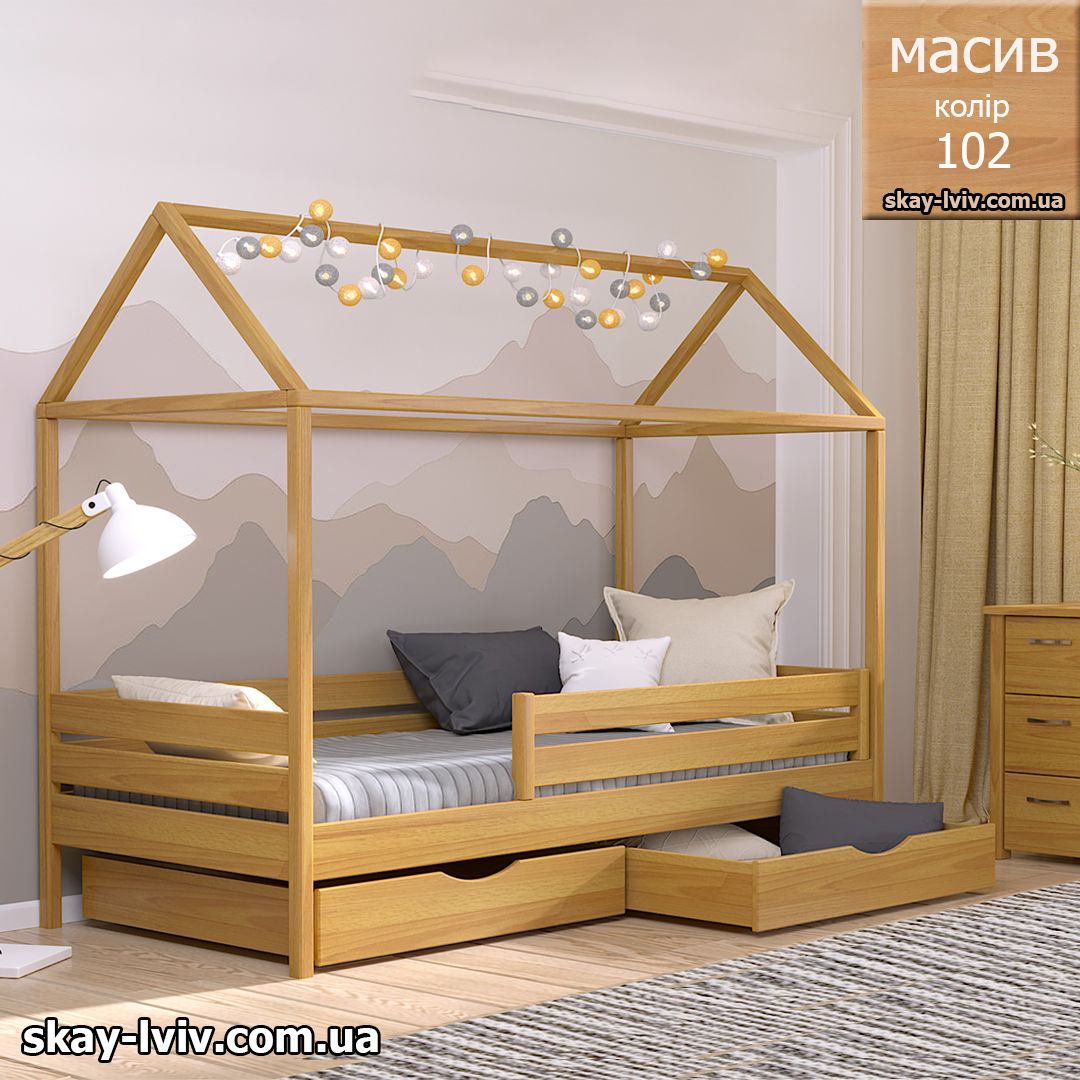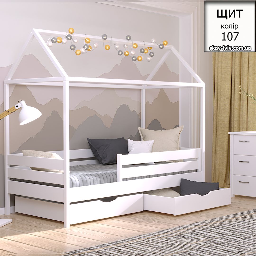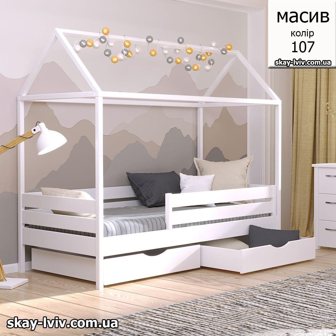 - казкова модель для дітей які обожнюють створювати свої затишні схованки в будиночках, де вони можуть втілити свої фантазії та відчути себе в безпеці. Її унікальність полягає у верхній частині, виконаній у формі даху. Тут можна легко розстеляти ковдру або інші тканини, за мить перетворюючи ліжечко на магічний замок.АММІ ліжко хатинка також може бути доповнене зручними і просторими шухлядами (окрема опція), призначеними для зберігання іграшок або постільної білизни. За бажанням, можна замовити додаткову подвійну планку безпеки, забезпечуючи надійний захист малюка від потенційних падінь.Модель АММІ ліжко хатинка доступна у двох варіантах виконання – зі щита або масиву, і пропонується у двох розмірах – 80х190см або 90х190см та доступна у 8-ми базових однотонних відтінках. Але особливість полягає в тому, що в АММІ можна комбінувати білий колір з іншими кольорами палітри, що дає змогу легко та гармонійно доповнити цим ліжечком будь-який інтер’єр. Крім того, АММІ ліжко хатинка може бути виконане з білими ніжками, що додасть їй особливого шарму.