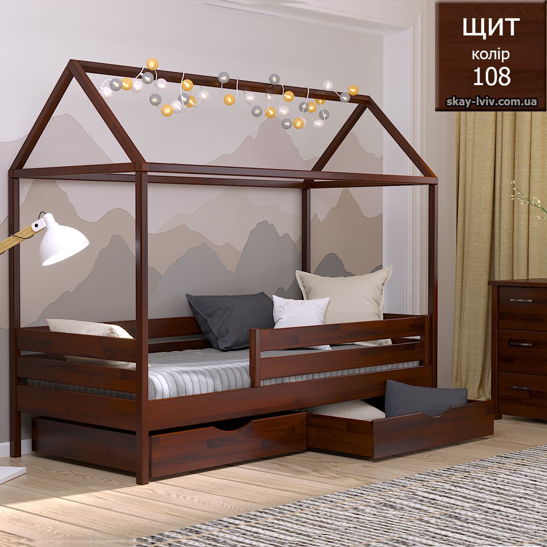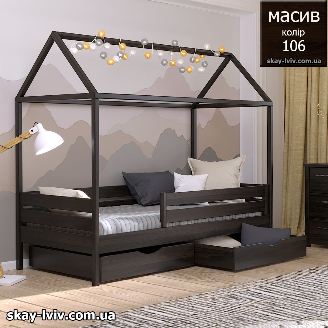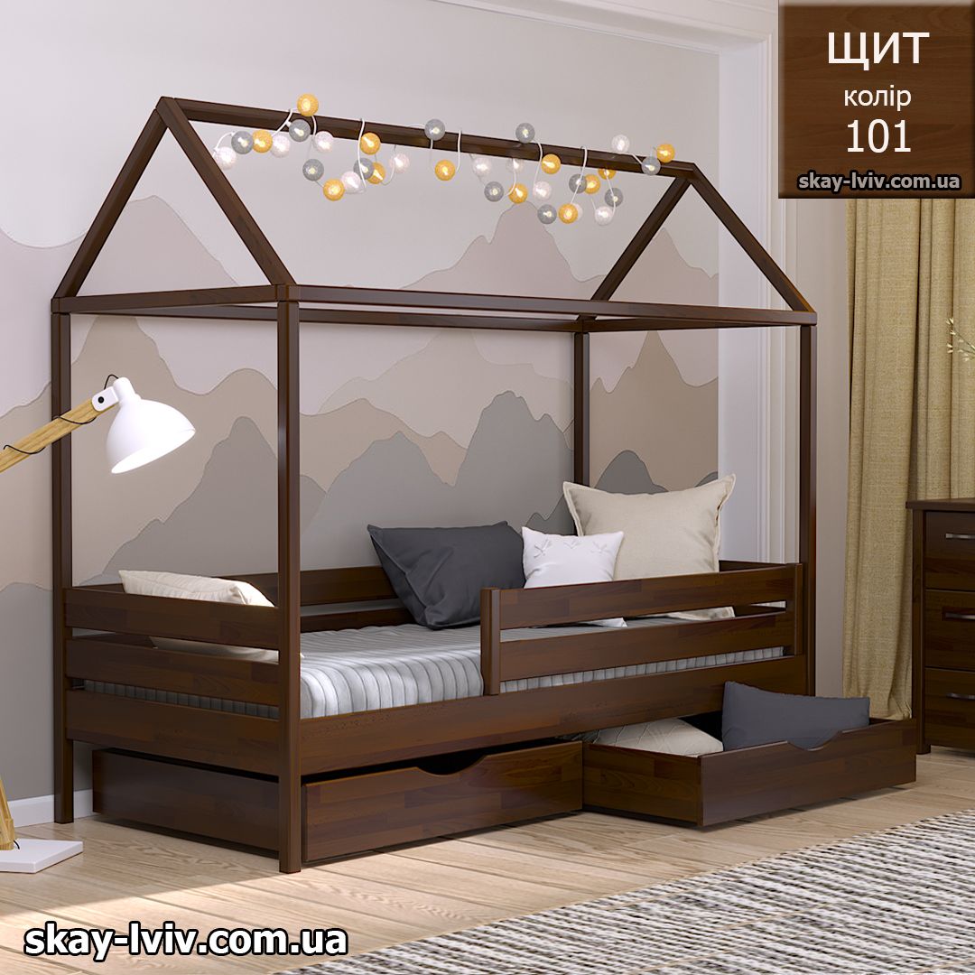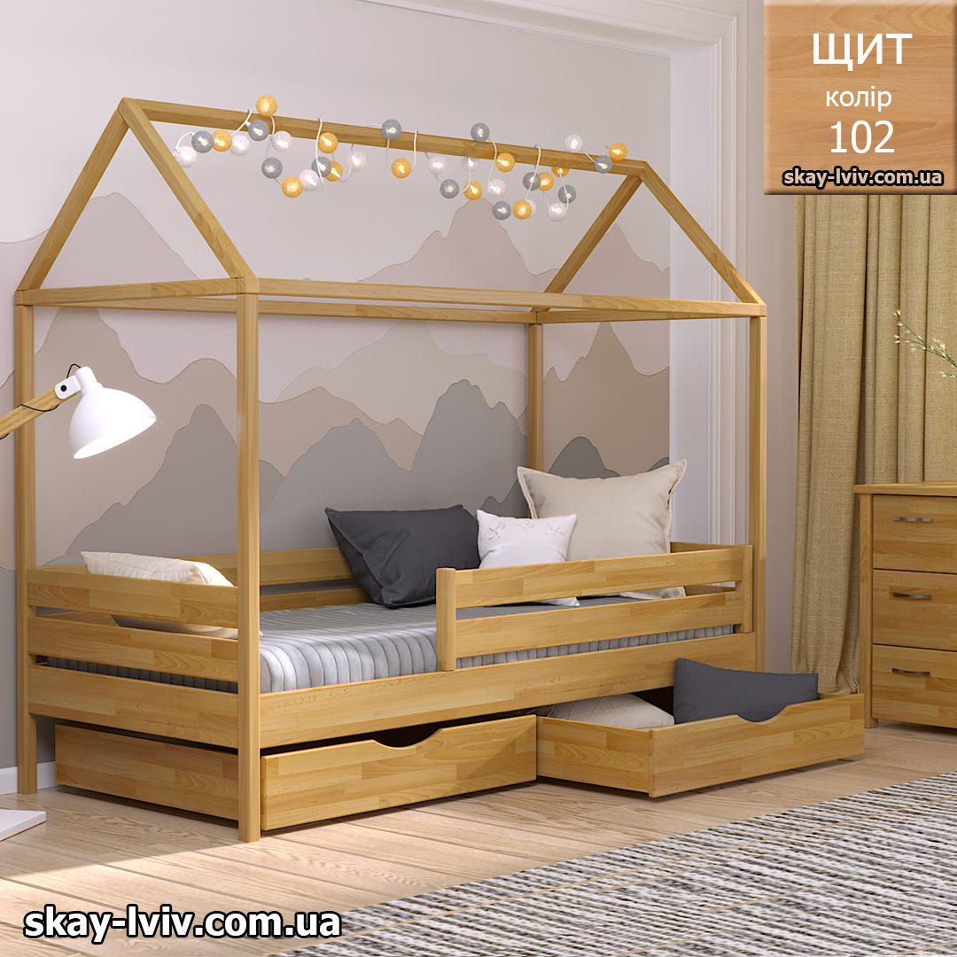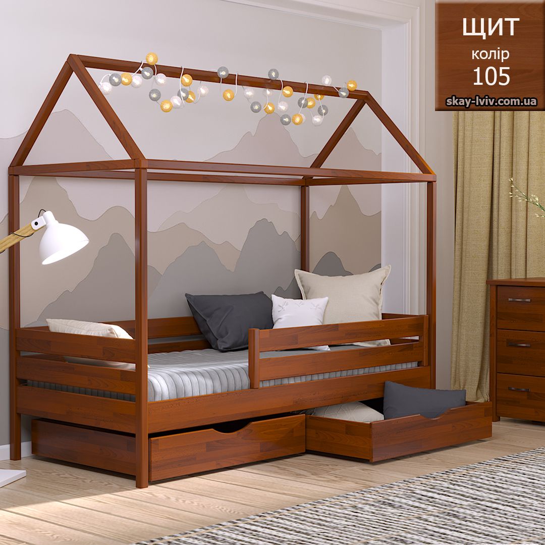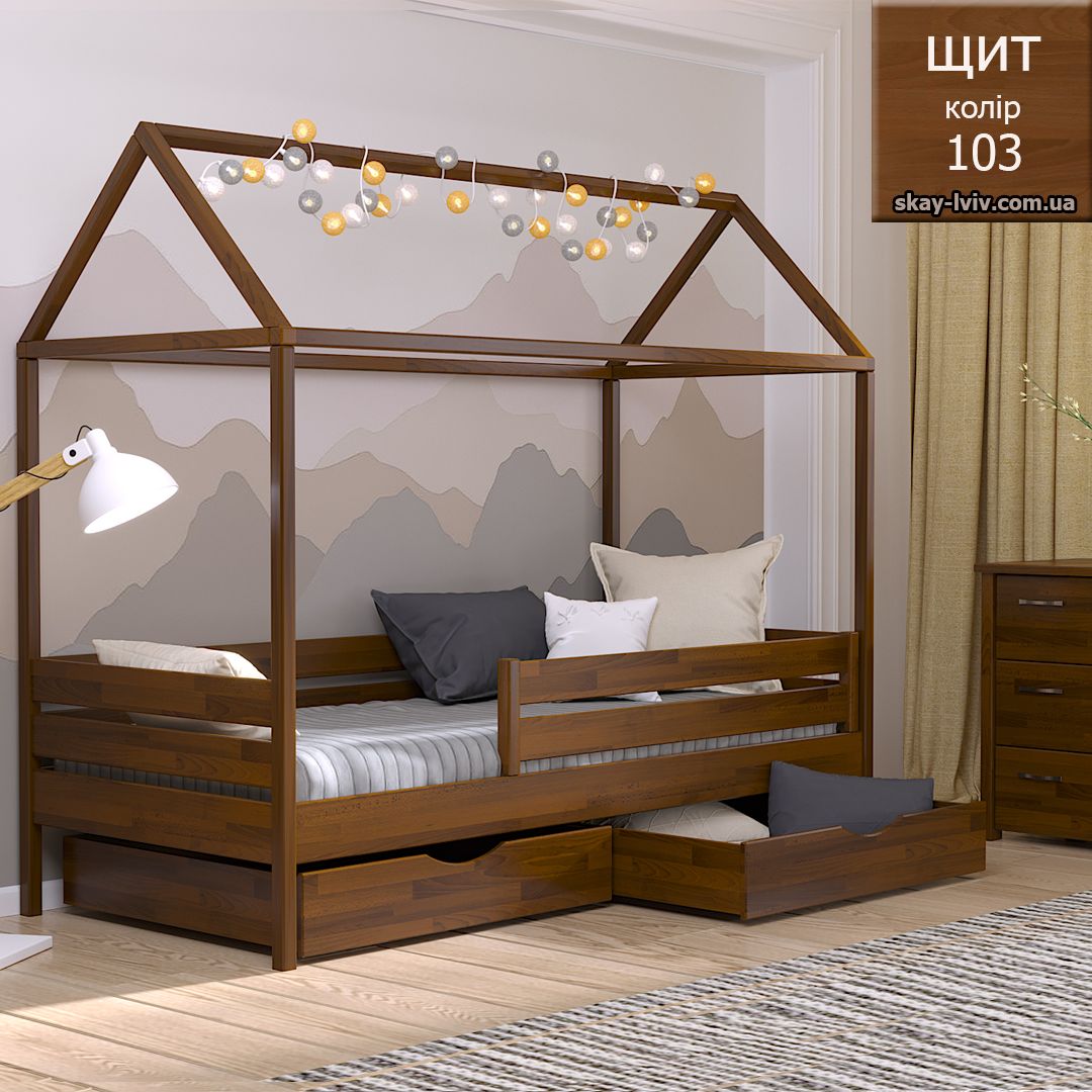 - казкова модель для дітей які обожнюють створювати свої затишні схованки в будиночках, де вони можуть втілити свої фантазії та відчути себе в безпеці. Її унікальність полягає у верхній частині, виконаній у формі даху. Тут можна легко розстеляти ковдру або інші тканини, за мить перетворюючи ліжечко на магічний замок.АММІ ліжко хатинка також може бути доповнене зручними і просторими шухлядами (окрема опція), призначеними для зберігання іграшок або постільної білизни. За бажанням, можна замовити додаткову подвійну планку безпеки, забезпечуючи надійний захист малюка від потенційних падінь.Модель АММІ ліжко хатинка доступна у двох варіантах виконання – зі щита або масиву, і пропонується у двох розмірах – 80х190см або 90х190см та доступна у 8-ми базових однотонних відтінках. Але особливість полягає в тому, що в АММІ можна комбінувати білий колір з іншими кольорами палітри, що дає змогу легко та гармонійно доповнити цим ліжечком будь-який інтер’єр. Крім того, АММІ ліжко хатинка може бути виконане з білими ніжками, що додасть їй особливого шарму.