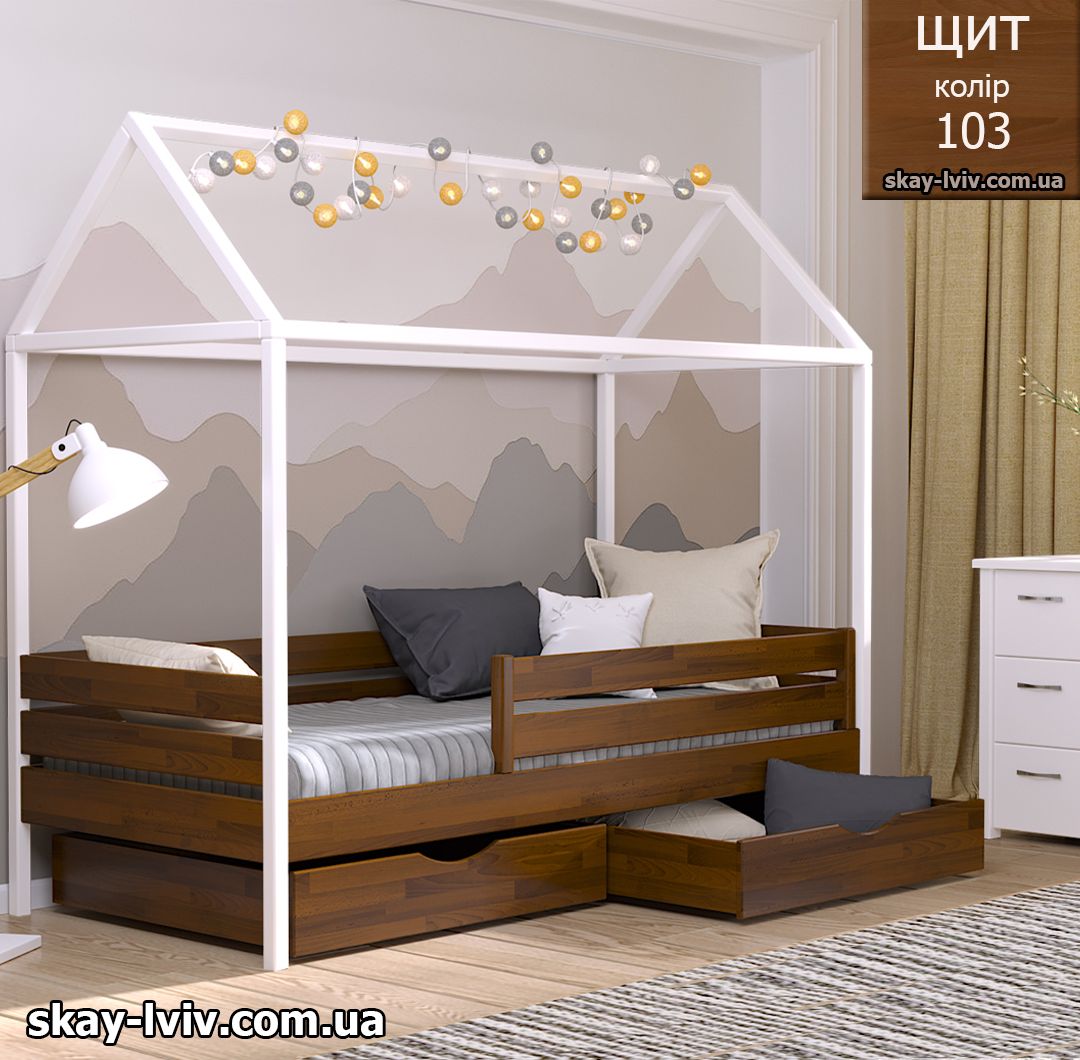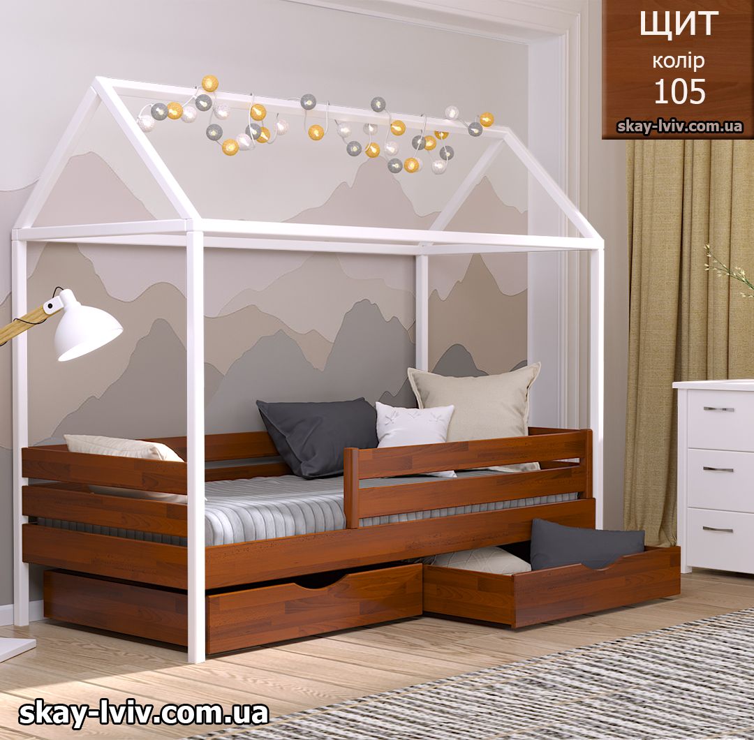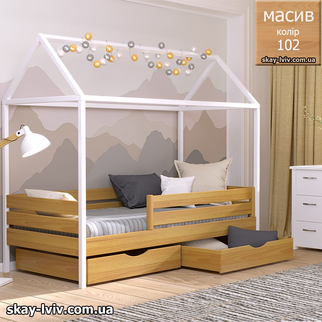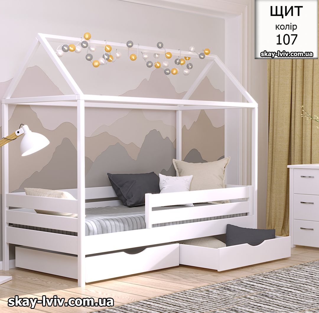 АММІ ліжко хатинка – казкова модель для дітей які обожнюють створювати свої затишні схованки в будиночках, де вони можуть втілити свої фантазії та відчути себе в безпеці. Її унікальність полягає у верхній частині, виконаній у формі даху. Тут можна легко розстеляти ковдру або інші тканини, за мить перетворюючи ліжечко на магічний замок.