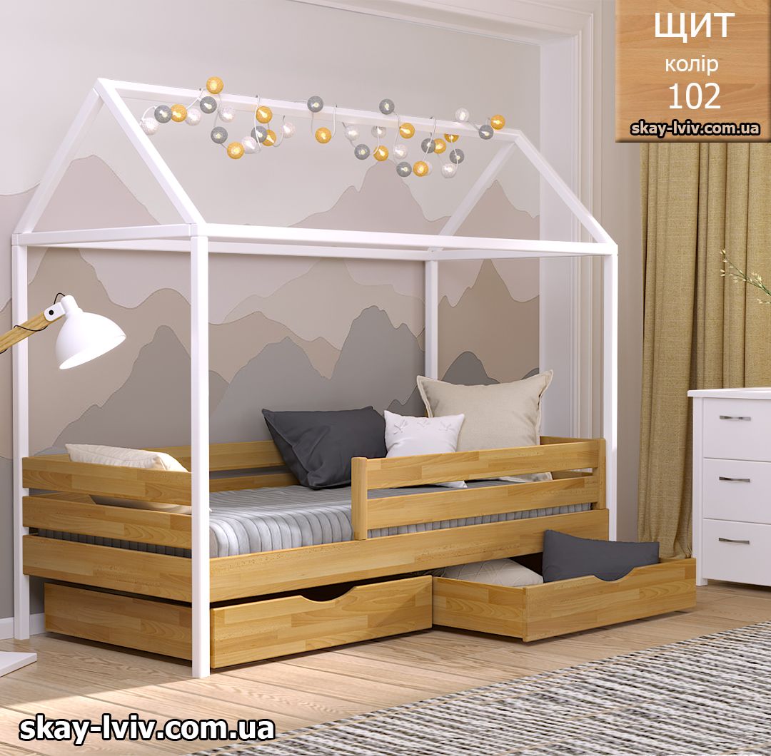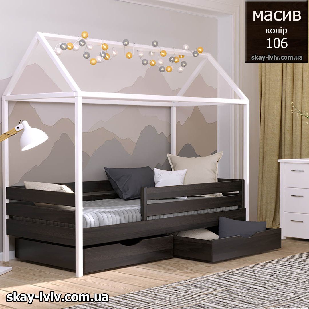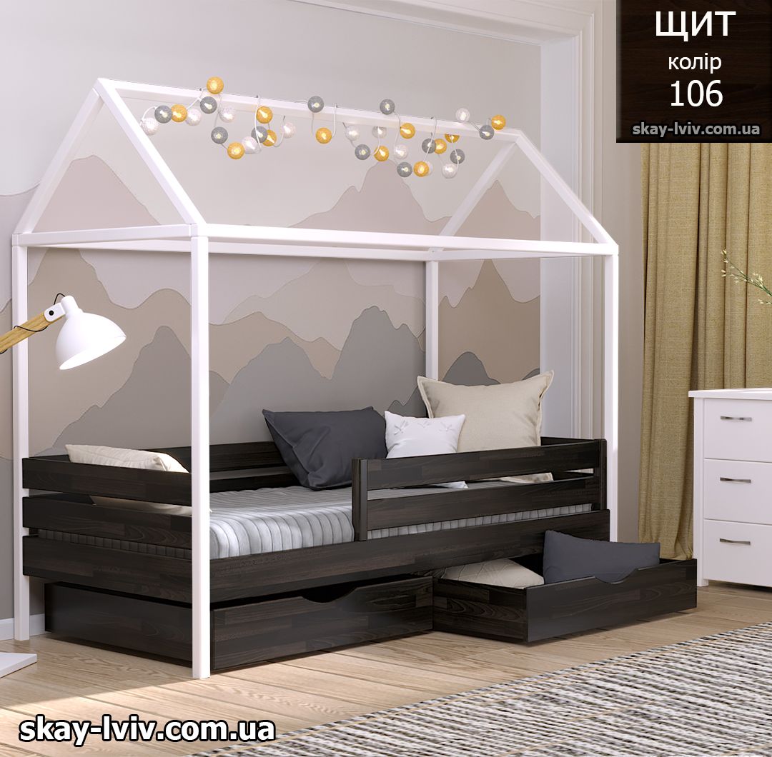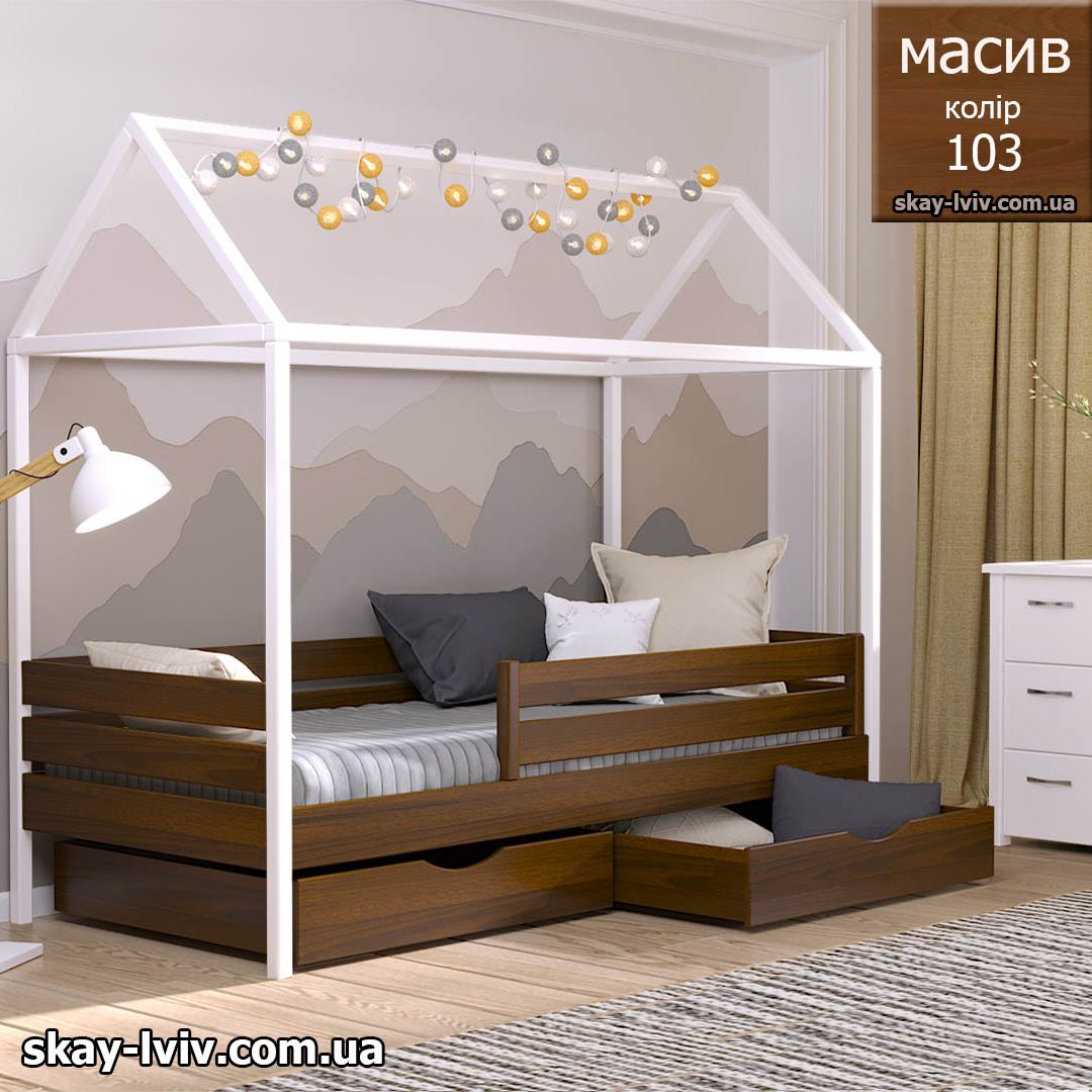 АММІ ліжко хатинка – казкова модель для дітей які обожнюють створювати свої затишні схованки в будиночках, де вони можуть втілити свої фантазії та відчути себе в безпеці. Її унікальність полягає у верхній частині, виконаній у формі даху. Тут можна легко розстеляти ковдру або інші тканини, за мить перетворюючи ліжечко на магічний замок.