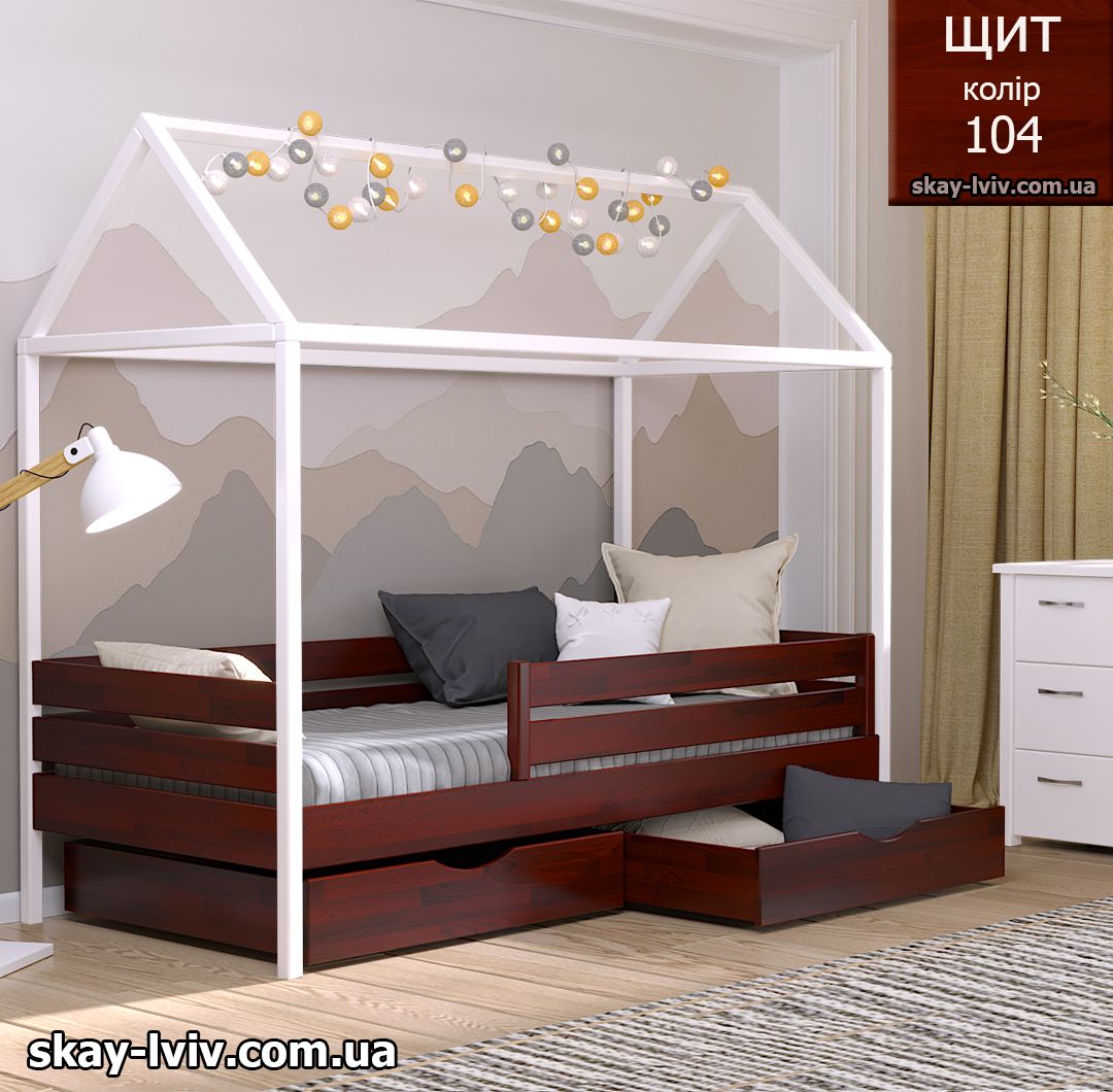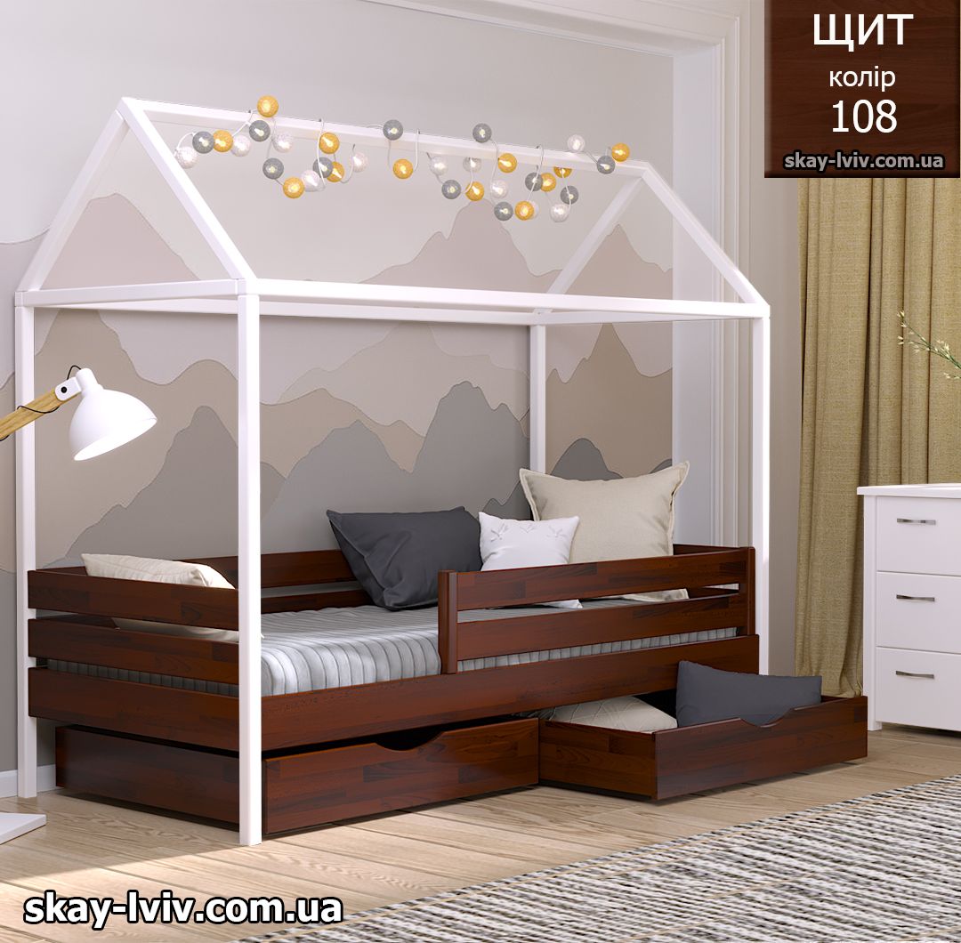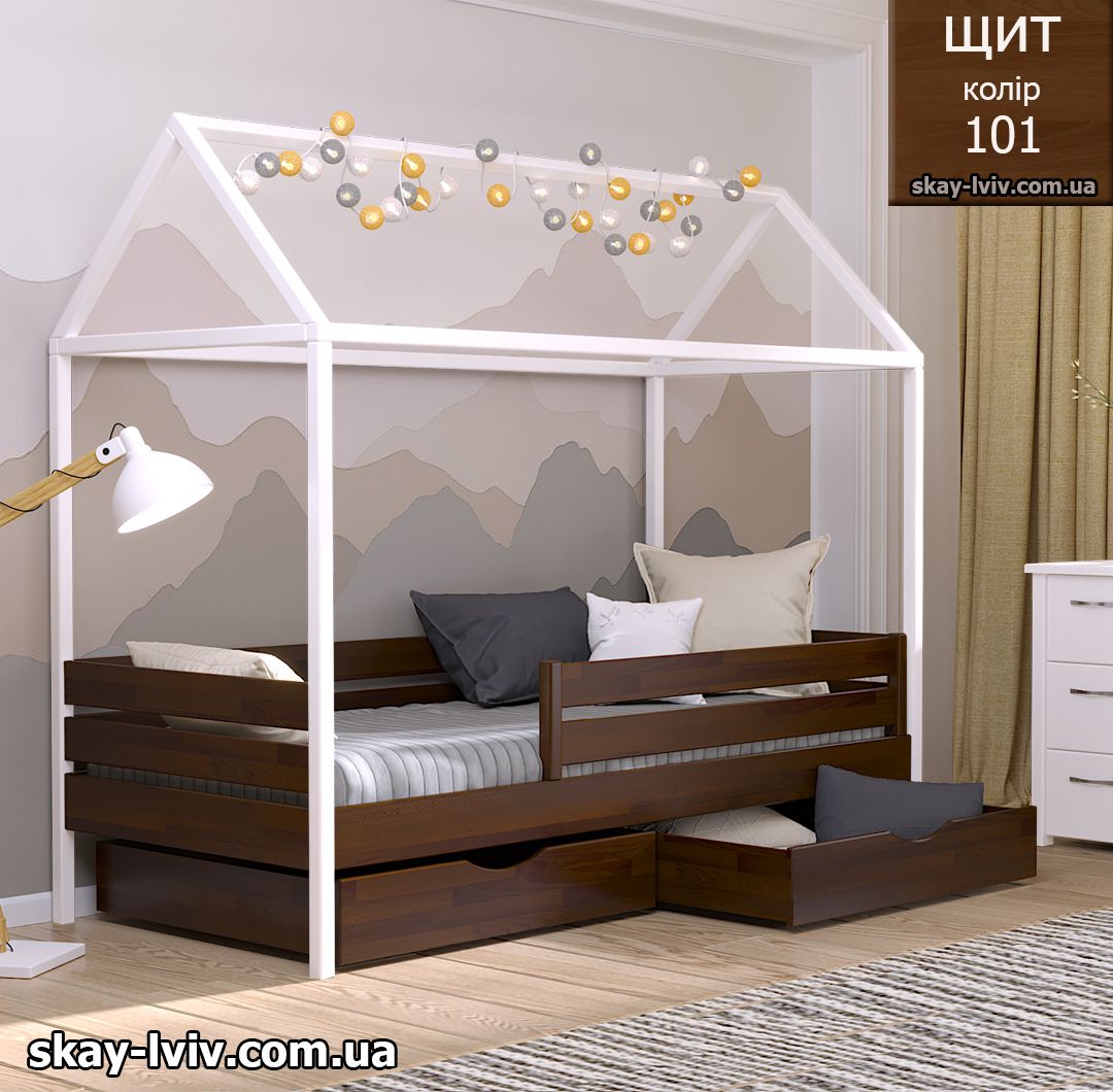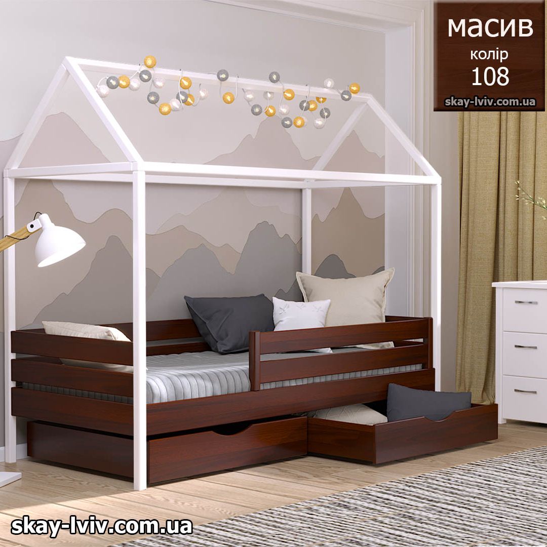 АММІ ліжко хатинка – казкова модель для дітей які обожнюють створювати свої затишні схованки в будиночках, де вони можуть втілити свої фантазії та відчути себе в безпеці. Її унікальність полягає у верхній частині, виконаній у формі даху. Тут можна легко розстеляти ковдру або інші тканини, за мить перетворюючи ліжечко на магічний замок.