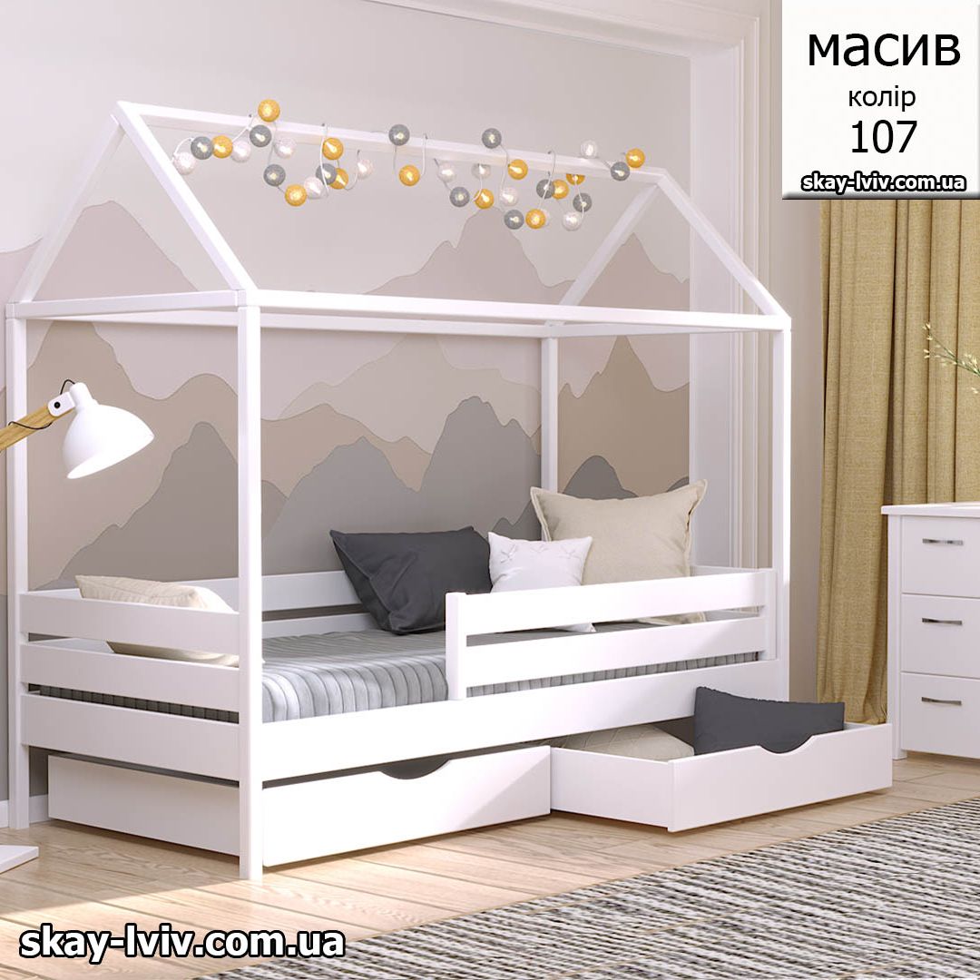 АММІ ліжко хатинка також може бути доповнене зручними і просторими шухлядами (окрема опція), призначеними для зберігання іграшок або постільної білизни. За бажанням, можна замовити додаткову подвійну планку безпеки, забезпечуючи надійний захист малюка від потенційних падінь.