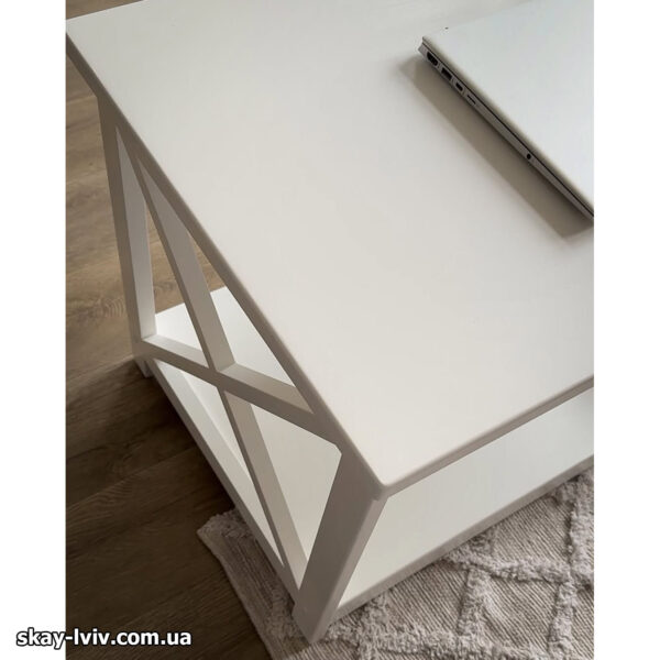 Дизайн зі стилізованими боковими “Х”‑перетинками додає легкості конструкції, водночас забезпечуючи їй стійкість та надійність. Завдяки універсальним розмірам стіл зручно використовувати у вітальні, спальній зоні, домашньому офісі або навіть у комерційних просторах, таких як салони краси чи готельні номери.