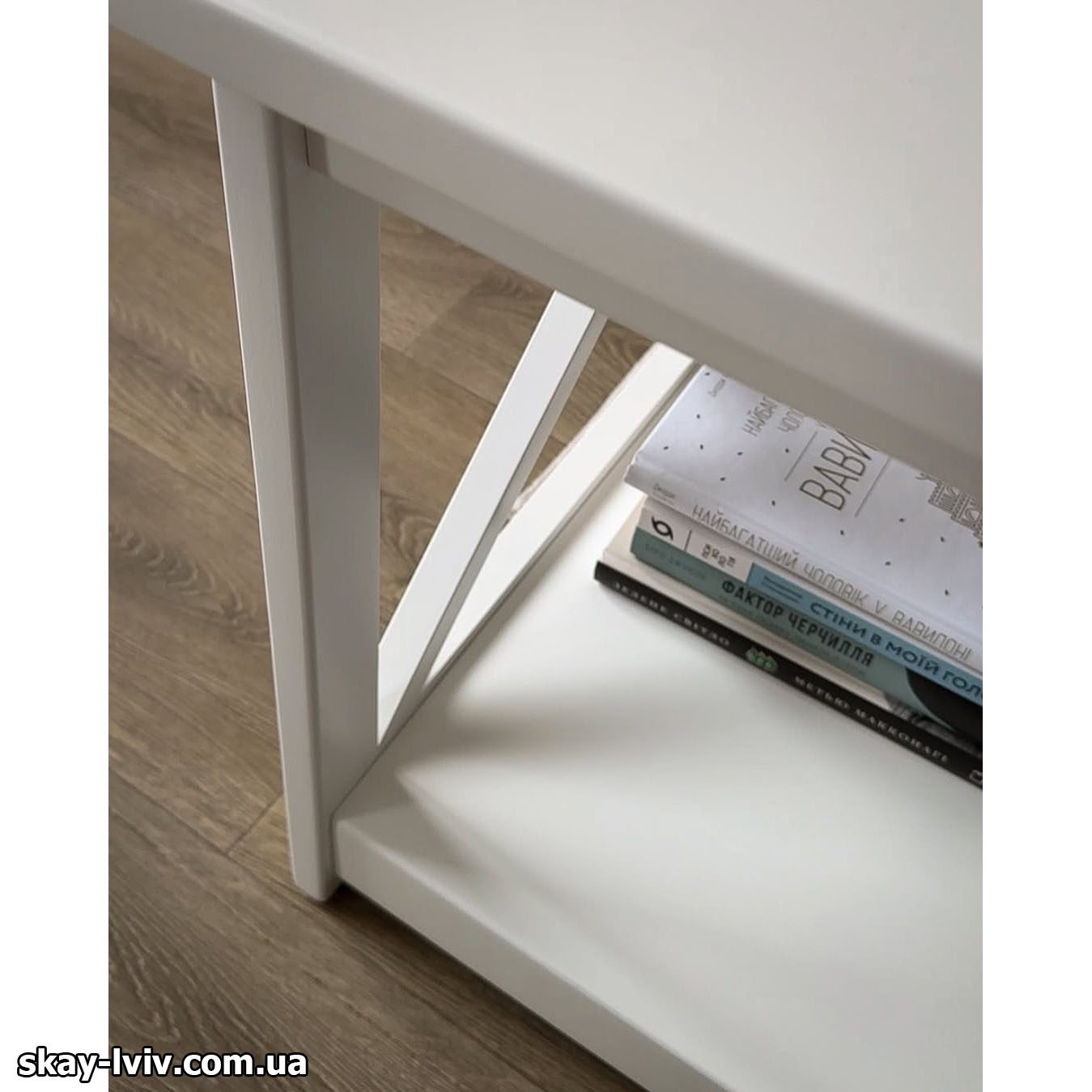 Під стільницею розташована додаткова полиця — ідеальна для зберігання журналів, книг, пульта, декоративних кошиків або пледів. Це робить стіл не лише естетично привабливим, а й практичним у щоденному вжитку.